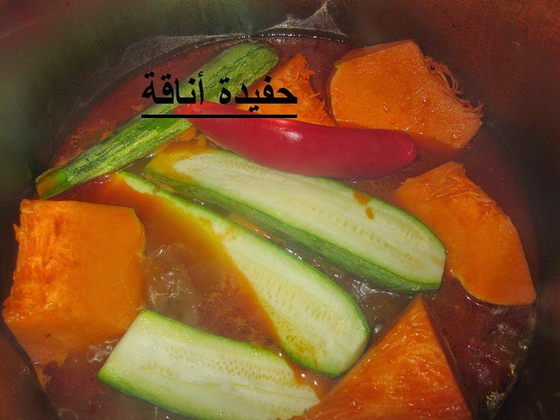 وكنرميو القرعة حمرا وخضرا وفلفلة حارة ونخليها حتى يدخلها طياب عاد نرميو الفورة الآخيرة بعد مادهنها بزيت العود وقبل مانرميها كندوقو الى ناقصة شي حاجة من لعطرية كنزيدوها