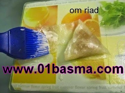نصنع من العقدة كويرات صغيرة ثم نأخد و رقة االبسطيلة و نقسمها نصفان و نضع العقدة و نشكلها كما في الصور حتى نحصل على مثلث نسده بي خليط الدقيق و الماء