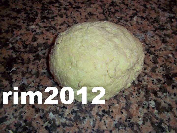 من جهة اخرى تخلط الزبدة مع الطحين ويفرك بين الاصابع دون الاكثار الى ان نحصل على مزيج بشكل حبيبات صغيرة مثل الكسكس و نضع حفرة وسط
