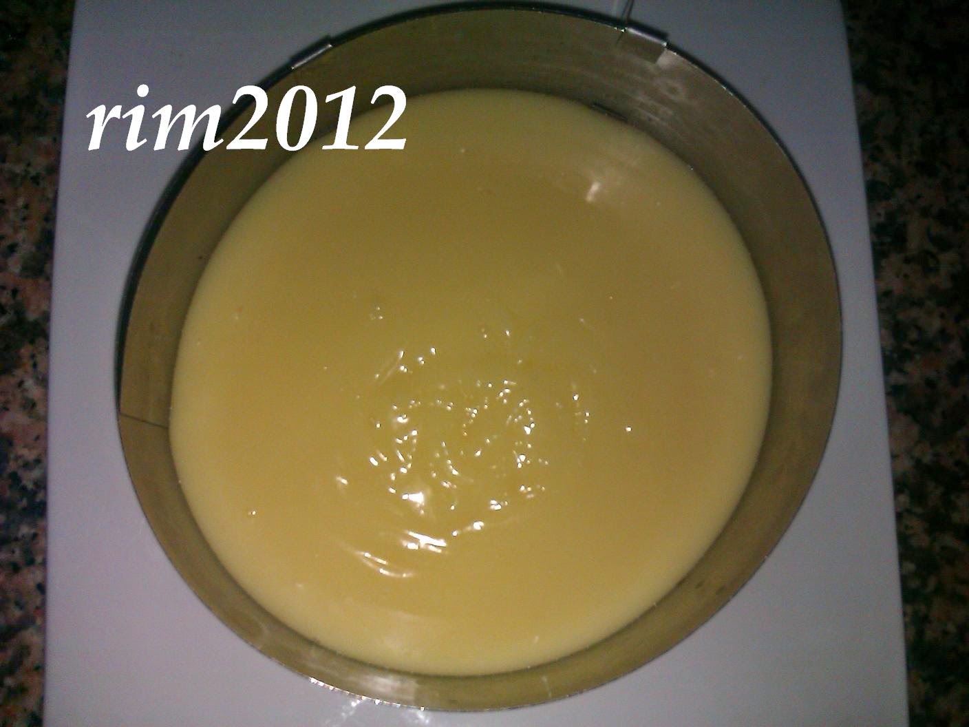 نخلطوعناصر الطبقة الاولى جيدا ونعملوه يطيبوعلى نار مهيلة مع التحراك حتى يعقاد الخليط ونصبو في ايطار مفتوح من الجهتين ونخليوه يبرد