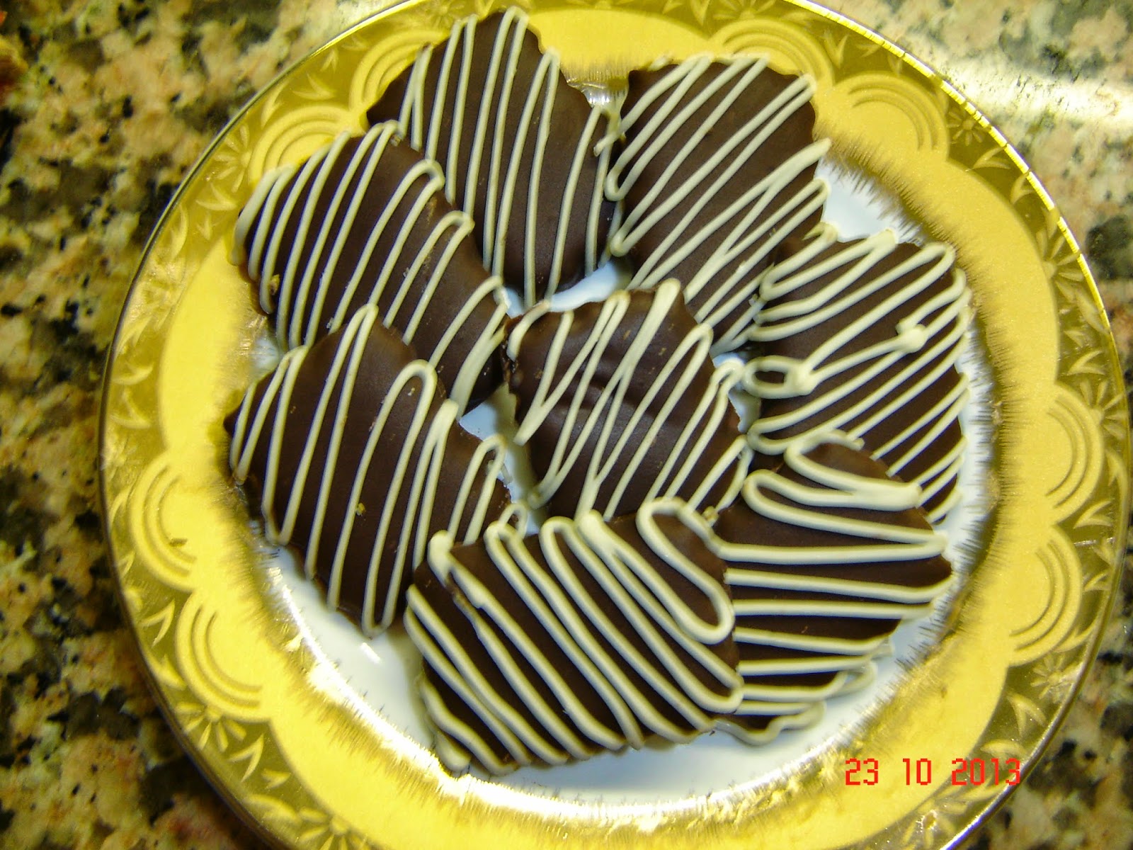 تم نضعهم في الفرن ملي يبردوا نغطسوهم في الشكلاط اسود مذاب في بان ماري تم نعملوا عليهم خطوط بالشكلاط ابيض
