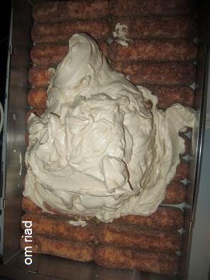 نغطس 24 قطعة من البسكوي في القهوة و نستفها في إطار تم نغطيها بالكريمة المنسمة بالقهوة