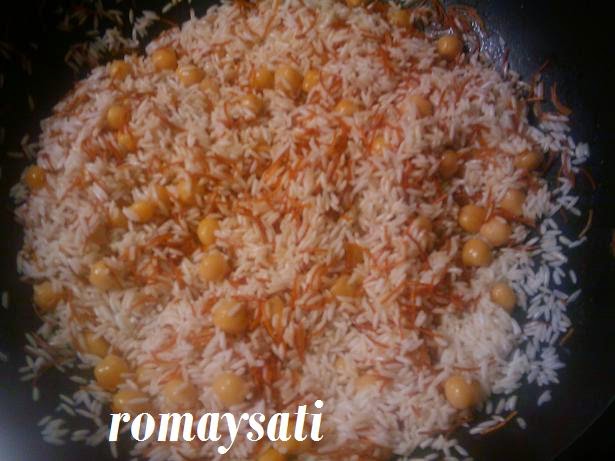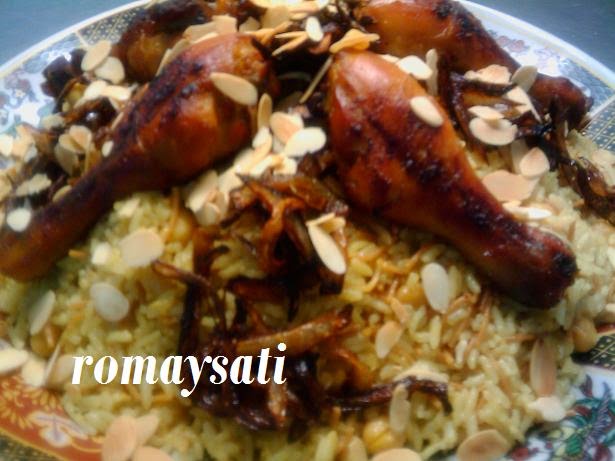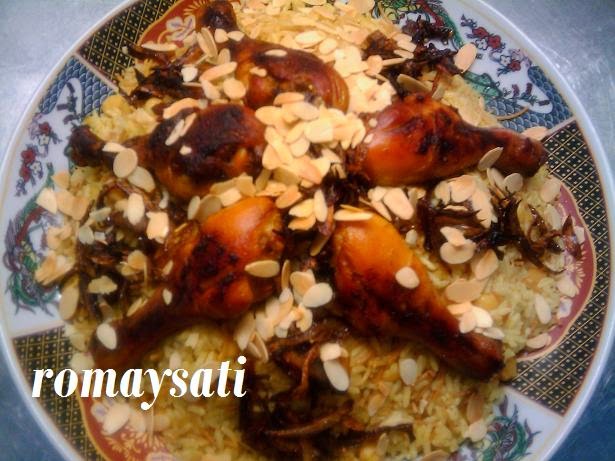 نزيدو الدجاج والعطرية كاس ماء صغير مني إطيب دجاج نحمروه في الفراننحمرو الشعرية في شوية الزبدة نزيدو عليها الحمص واللروز مغسول نديرو 3 كيسان الماء ملح إبزار مني إطيب الروز نخويو عليه مريقة الدجاج ونحركونحمرو البصلة في شوية الزبدة والملحنقدمو الروز نزلو فوقو دجاج والبصلة لي حمرنا في الزبدة ونزينوه باللوز