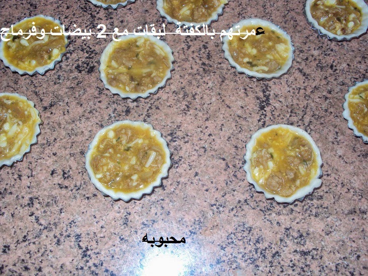 بلاطو لكملتو كندخلو لثلاجة باش عجينة تقصاح حتى كملت ودهنتهم باصفر البيض مع قطرة زيت ماكانش عندي جنجلان وستعملت لوز ايفلي وفرماج واعشاب منسمة في تزين الوجه