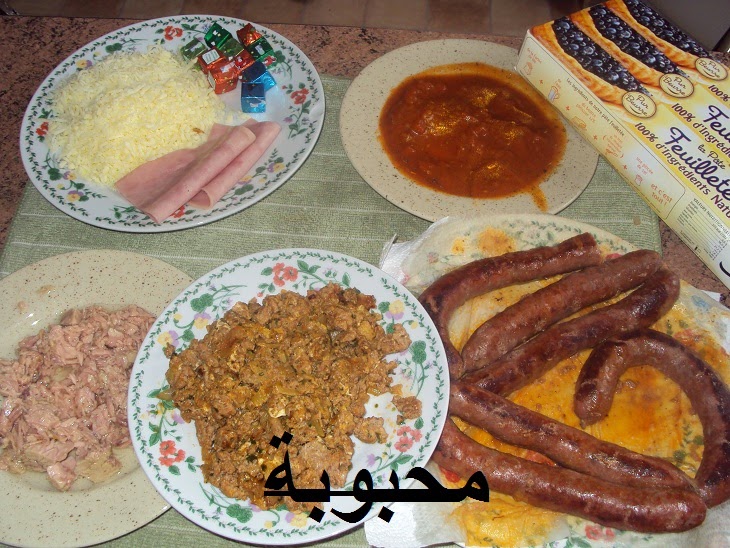 حاجتنا في عجين مورق صوصيص مقلي كفتة مشحرة مع بصلة ومعدنوس وتوابل ومجموعة ببيضة فرماج محكوك طون صلصة طماطم موتارد اعشاب منسمة كاشير اوشرائح لادند جبن متلثات ولكين كل هاد مكونات بكمية صغيرة ماشي بزاف الا نسيت شي حاجة غدي ندكرها في مراحل