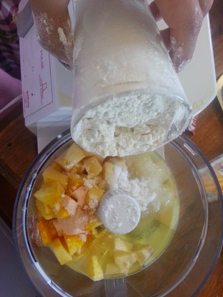 و نطحن جيدا نصب الخليط في قالب الكيك و نحتاج الى تفاح اخر للتزيين نضعه من فوق او الموز او الخوخ و ندخلها للفرن تطهى مثل الكيك
