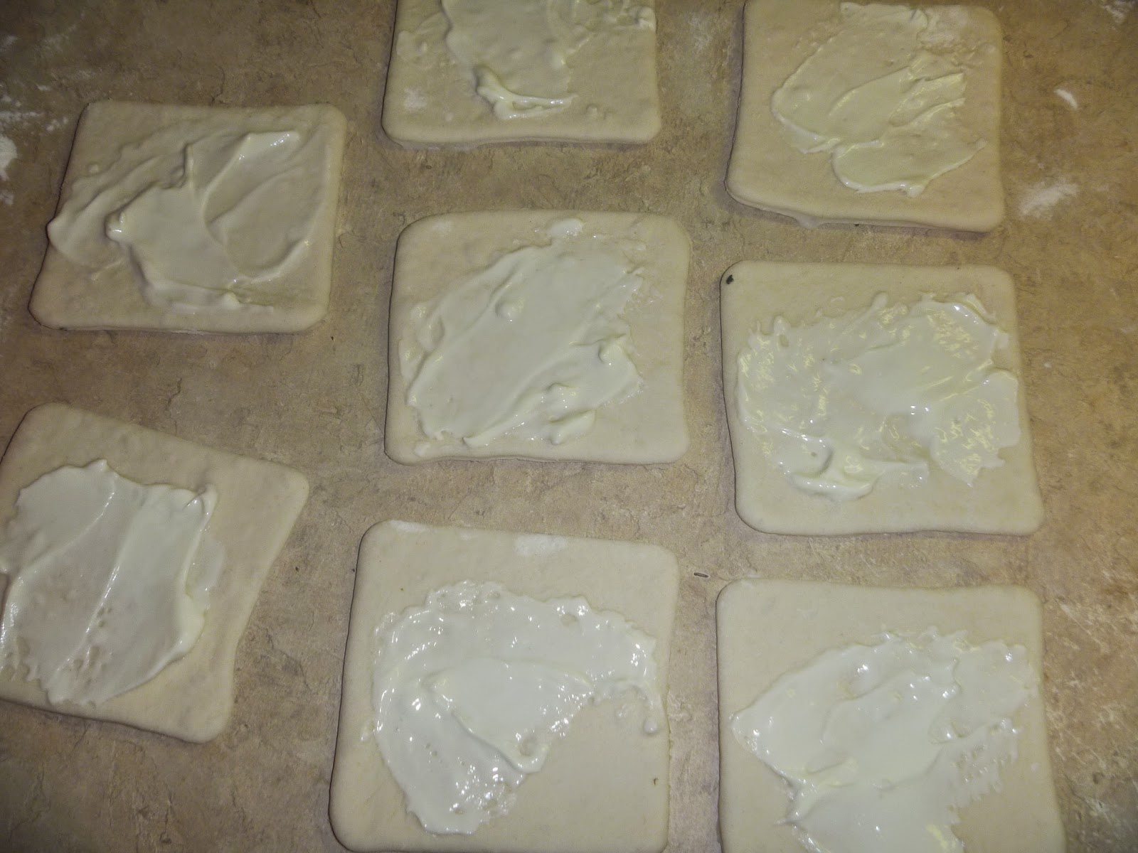 قطعت العجين مربعات dhenthom ف الفروماج ممكن دهنو بالميونيز