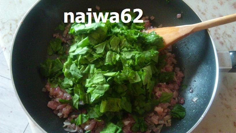 نشحر البصلة فمعلقة زيت زيتون مع الملح حتى تدبل. نزيد سبانخ ونحرك حتى ينشف من الماء. نزيد جبن.ونقاد ملح وبزار حسب الذوق