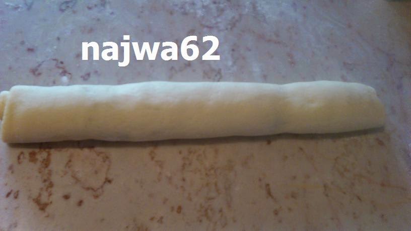 نطلقوها على شكل مستطيل ونسرحو فوقها حشوة سبانخ ونرشوها بفرماج محكوك ونلويها. نقطع دوائر غلاض و نحطهم فمول مذهون ونخليهم يخمرو.