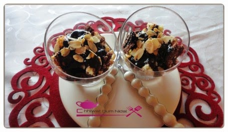 وهنا جوانب الكيك اللي قطعنا كنعملوهوم في كؤوس و نصب عليه الكلاساج و نزين برقائق اللوز