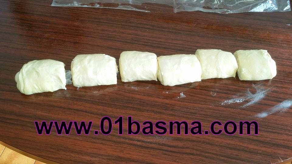 تنيوها على 3 تصبح على شكل مستطيل ندهوه مرة اخرى بزبدة و الفينو