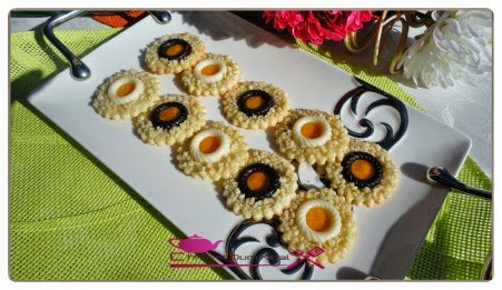 ناخذ دائرة الصابلي و ندهنها بخليط الناباج و الكليكوز ونضع دائرة الشوكولا في الوسط ثم نرش الجوانب باللوز و نملأ و سط الشوكولا بالمربى