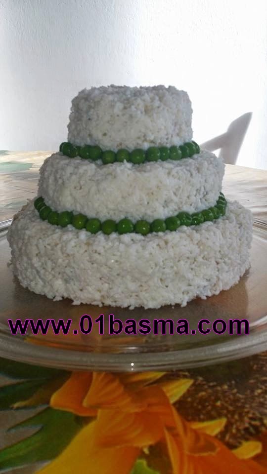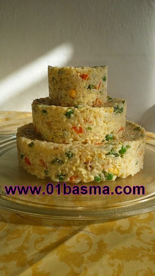 ارز مصلوق وخضار مشكلة مصلوقة زيتون دوائر وذرة والطون والبيض مصلوق غير الاصفر ونحتفض بالابيض للتزيين وطريفات من السؤريمي والكروفيط والكامار مسوطين فالزبدة الملحة والابزار نخلطوا الكل بالميونيز ونضعهم في الايطار الصور توضح الطريقة