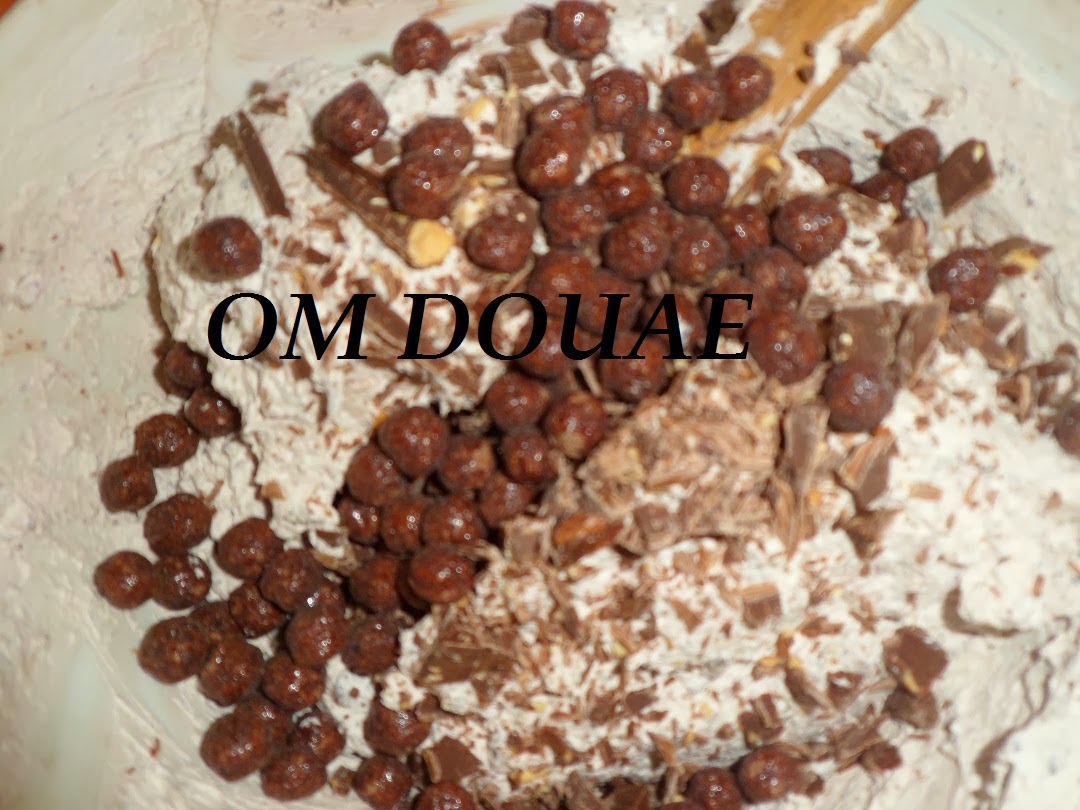 ثم نضيفو للكريمة 2 قطعات شكلاط ماروخا مقطعة رقيقة مع حبيبات الشكلاط المقرمشة( حسب الرغبة)