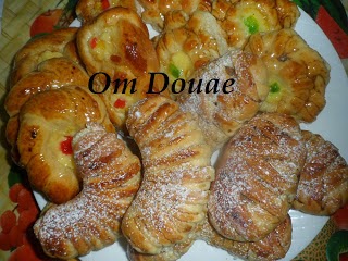 نوضعوهم فطاوة مدهونة بالزبدة مرشوشة بالدقيق .نزينهم بالفواكه معسلة ونغطيو عليهم يخمرو من بعد ندهنوهم باصفر البيض مخلط مع نيسكافي وقطيرات الخل و ندخلوهم لفرن