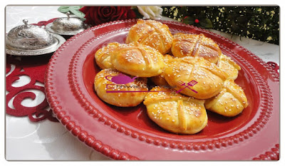 نقطع شرائط رقيقة و نضعه على شكل + ثم ندهن اصفر البيض و نرش الزنجلان ثم ندخلهم الفرن