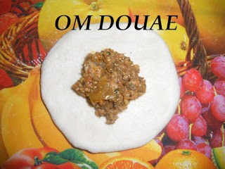 نغطيو عليهم مرة ثانية يرتاحو ربع ساعة من بعد نطلقو الكرة الاولى كيفما موضح فالصورة نوضعو الحشوة الوسط حسب رغبة كل سيدة انا استعملت بصلة مشحرة مع لكفتة