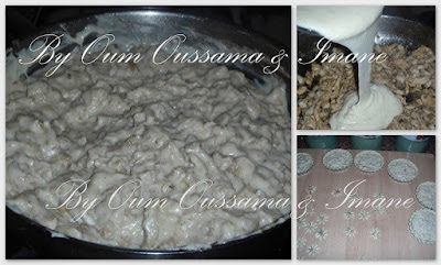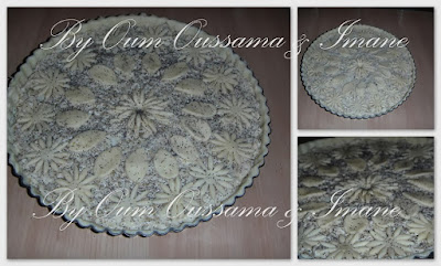 نطلق العجينة ونلبسها للمول ونعمل وسطها الحشوة ونزين بوريدات من نفس العجينة مطلوقة رقيقة ونرش عليها زريعة الخشخاش وندخلها للفران حتى تتحمر