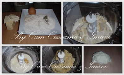 مقادير العجين : 300 غ دقيق الفورص + 150 غ زبدة خاصة بالتوراق وهدا هو السر باش كتجي العجينة هشيشة ومقرمشة وكتجي بحال إلا ورقناها + 1 بيضة + شوية ملح + شوية إبزار + رشيشة د الكوزة + من 2 ل 3 م ك ماء