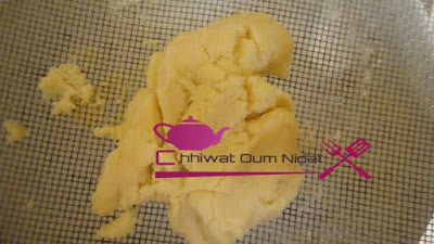 نمرر العجين في غربال ذا ثقوب كبيرة. (يمكن إضافة شوية دقيق لتسهيل مرور العجين)