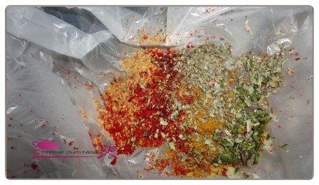 في بلاستيك غذائي نمزج مكونات التتبيلة و نمزجها ثم نضيف لها الباذنجان و نمزج ثم نقليه في زيت ساخنة