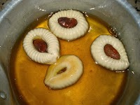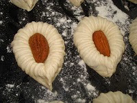 ضعي حبة لوز في الوسط و إضغطي عليها جيدا، ضعيها في صيبية مرشوشة بالفرينة
