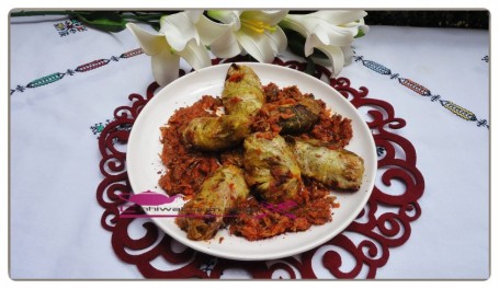 في طبق الفرن نحك الطماطم بعد ما نزعنا البذر و نضيف التوابل الزيت و القزبر و المعدنوس و نمزج ثم نصفف الملفوف المحشو و ندخل الفرن