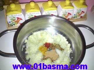 في طنجرة نضع بصلة محكوكة و فرعان من الثوم