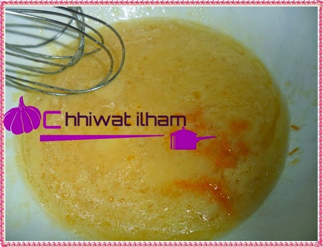 كنخلطو البيض والسكر جيدا تم نضيف الزيت العصير والجزر
