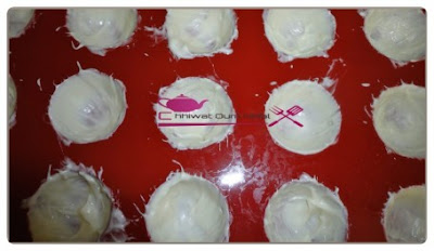 نملأ قوقعة الشكلاط بخليط الفواكه الجافة ثم نضعها على قاعدة البيسكوي