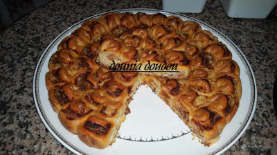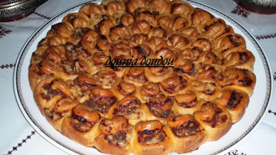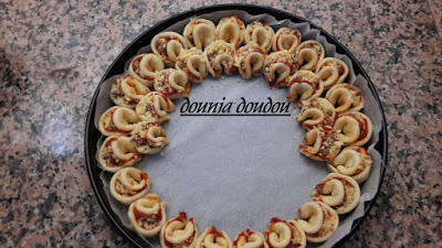 بعد ان ترتاح العجين قليلا تورق و تقطع بالكاس و تدهن بالصلصة ثم نضع الكفتة و نرش بالفرماج
