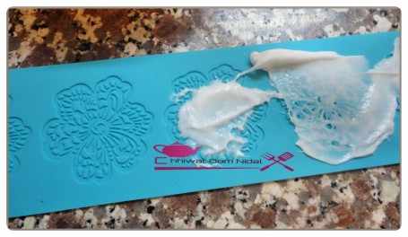 ثم بسباتول نضع الخليط في قالب السيليكون الخاص بعجين الدانتيل و نملأه جيدا ثم نزيل الزوائد ثم ندخله للفرن 15 دقيقة على حرارة 80 درجة