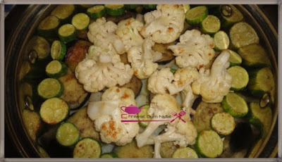 ثم نصفف الخضر طبقات فوق بعضها في مقلاة أو طنجره (من الأفضل استعمال مقلاة ليسهل قلبها)
