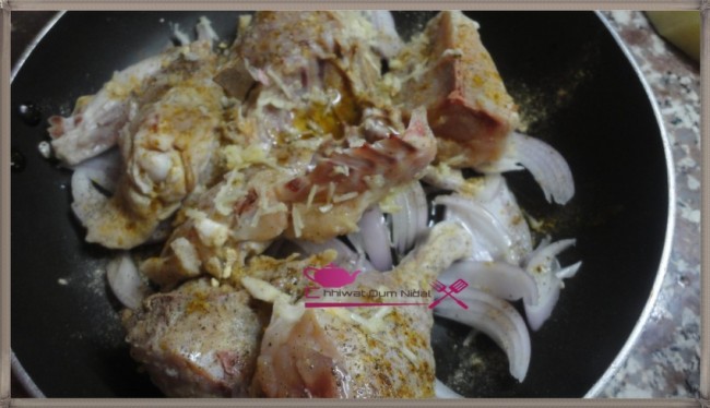 في مقلاة نشحر البصل مع الدجاج وملح ابزار خرقوم زيت زيتون و القليل من توابل مروزية أو راس الحانوت