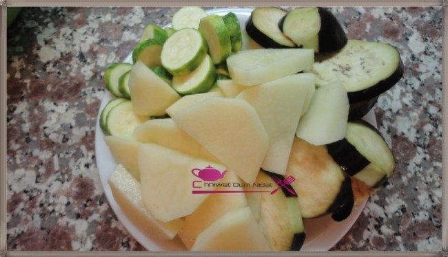 ناخذ الدنجال البطاطا و الكرعة نقطعهم على شكل دوائر ثم نقليها قليلا في القليل من الزيت كل نوع لوحده