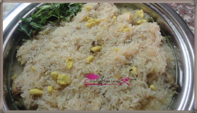 ثم نضيف الروز بعد غسله جيدا و نرش قليلا من ضامة بنه الدجاج و نضع حزمة قزبر و معدنوس ثم نضيف الماء الكافي و نغطى ثم نتركه على نار معتدله حتى يطهى  و نغطى ثم نتركه على نار معتدله حتى يطهى و يجف من الماء تماما (يمكن إضافة الماء عند الحاجة)
