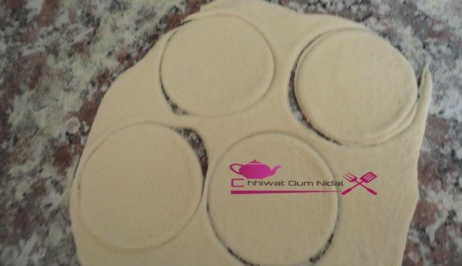 نأخذ كويرة من العجين نبسطها بالمدلك جيدا
