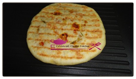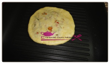ناخذ كويرة العجين و نبسطها قليلا و نضع القليل من الحشوة و نجمع عليها العجين