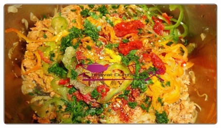 نقطع البصل شرائح رقيقة و نضعه على النار مع الزيت و الملح و نحرك حتى يذبل ثم نضيف الكفتة الفلفل الوان مقطر شرائح رقيقة و باقي المكونات و نحرك حتى تستوي الكفتة