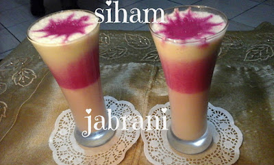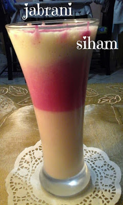 في الخلاط الكهربائي نطحن 2باربات (الشمندر) متوسطين مسلوقين ومقشرين مع سكر حسب الذوق و ربع لتر حليب 6 حبات فريز (فراولة) ملعقتين ياغورت ونطحن الكل ونصبه فوق عصير الخيار غير بشوية وندخله للثلاجة لمدة ساعة بعد ذلك سنحصل على هذه الشكل بحيث الباربا تكون في الوسط و الخيار في الاسفل و الاعلى