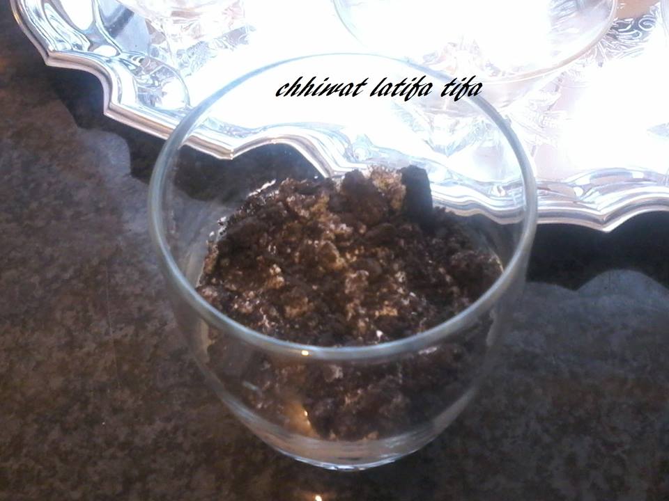 نضيع خليط المسكربون و الشانتيي في كؤوس و نزينه حسب الرغبة نضعه في الثلاجة 2 حتى 3 ساعات