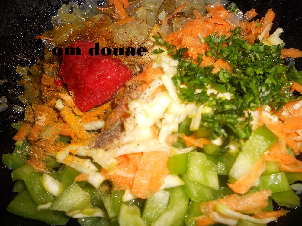 في مقلاة نضع بصلة مقطعة الى قطع صغيرة مع وريقات موسى و القليل من زيت الزيتون و نضعها فوق النار حتى تذبل من بعد نضيف لها الجزر محكوك  كرعة خضراء محكوكة فلفلة مقطعة قزبر و معدنوس مقطع معلقة طماطم مصبرة