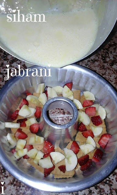 ونأخد نصف ليتر حليب مع 2 فلان بنكهة الكراميل وملعقتين سكر،ملعقة صغيرة نشا ونضع الكل فوق النار حتى الغليان ونفرغه فوق طبقة البسكوي والفواكه وندخله للثلاجة حتى يتماسك