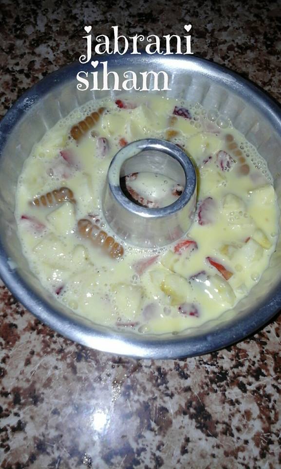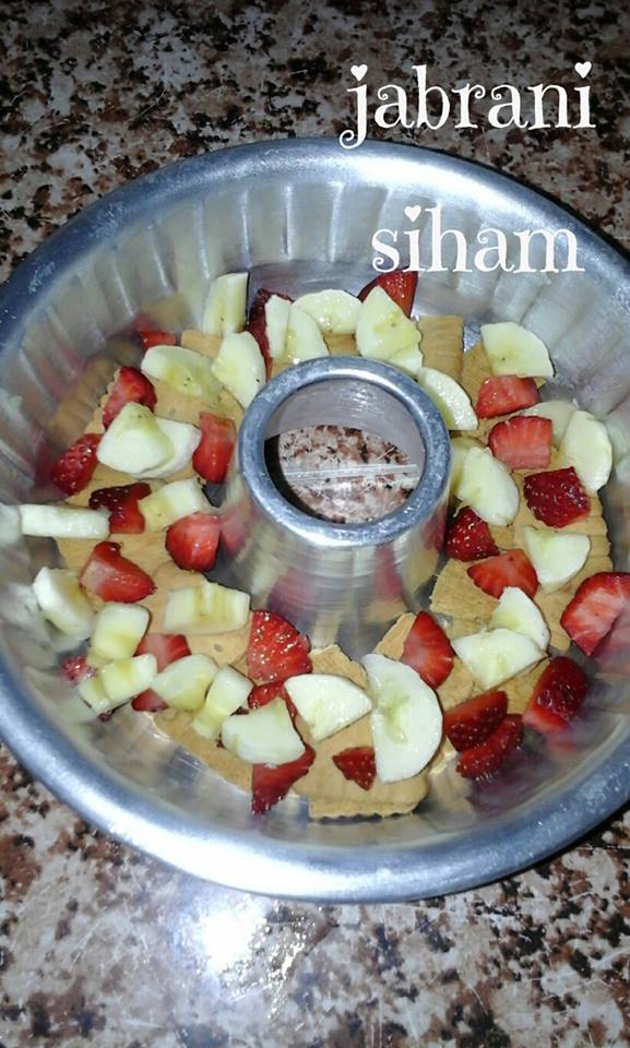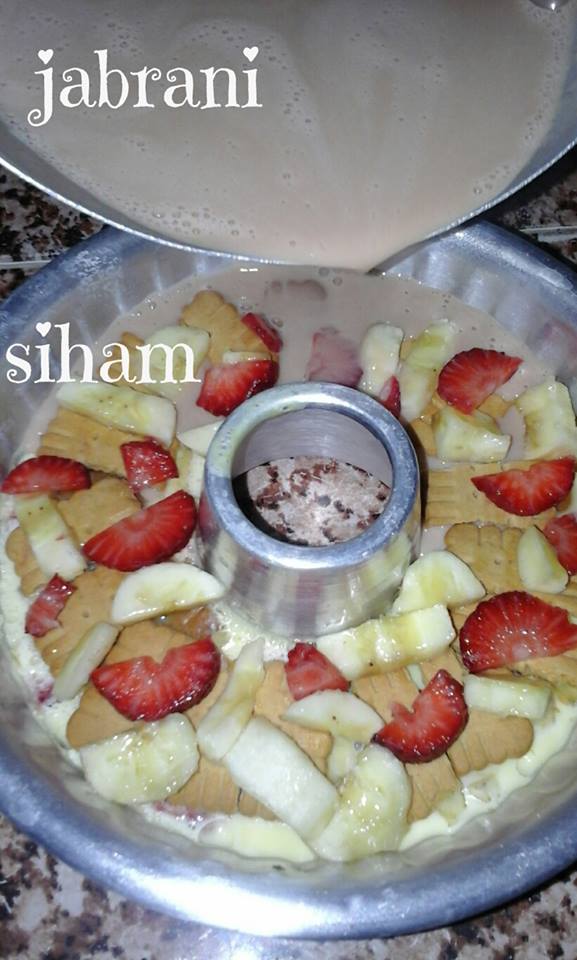 ونأخد نصف ليتر حليب مع 2 فلان بنكهة الكراميل وملعقتين سكر،ملعقة صغيرة نشا ونضع الكل فوق النار حتى الغليان ونفرغه فوق طبقة البسكوي والفواكه وندخله للثلاجة حتى يتماسك