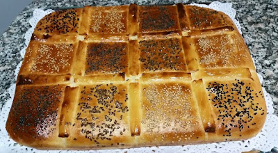 بعد ان تخمر العجين نبسطها رقيقة و نضع فوقها الحشوة المطهوة سابقا