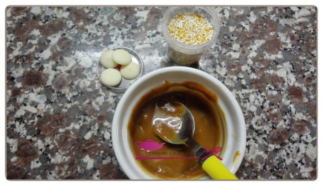 نلصق القلب بالاخر المزين بالكراميل و نرش حبيبات العقيق ثم نلصق في الجهة الاخرى و نزينه بالبودرة