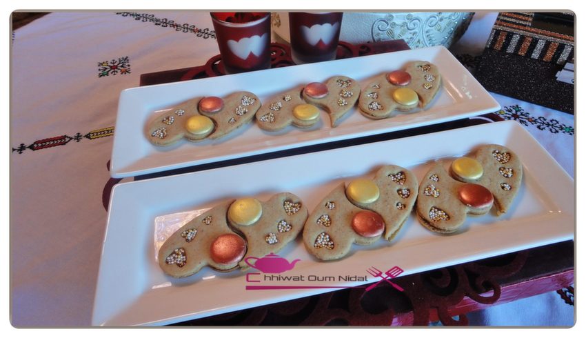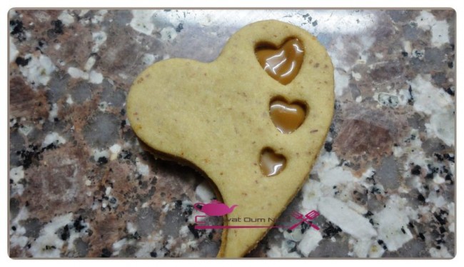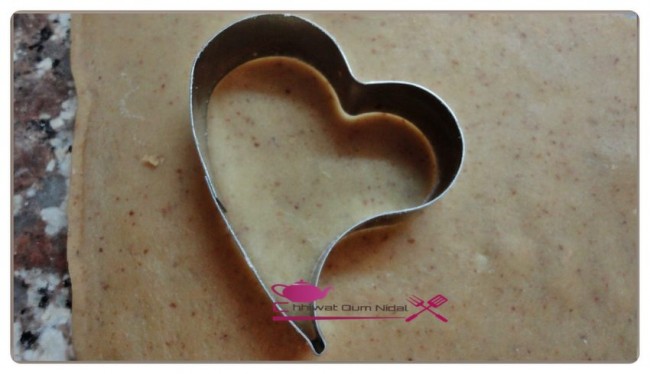 نبسط العجين جيدا و نقطعه على شكل قلوب و اخرى نزينها بقلوب صغيرة و ندخلها الفرن
