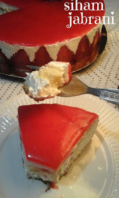 ونحضر الطبقة الاخيرة اللي فيها :200g فريز مطحون مع نصف كاس سكر ونعمله فوق النار حتى يغلا ونضيف له 2وريقات جيلاتين اللي عملناهم في الماء بارد من قبل ومعصورين ونطفئ عليه وحتى يبرد تماااما ونضيفه للحلوى كطبقة اخيرة وندخلها للثلاجة يستحسن ليلة كاملة وتقدم باردة