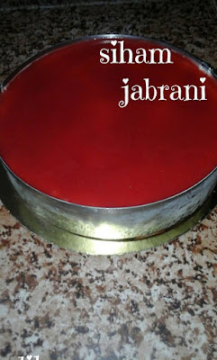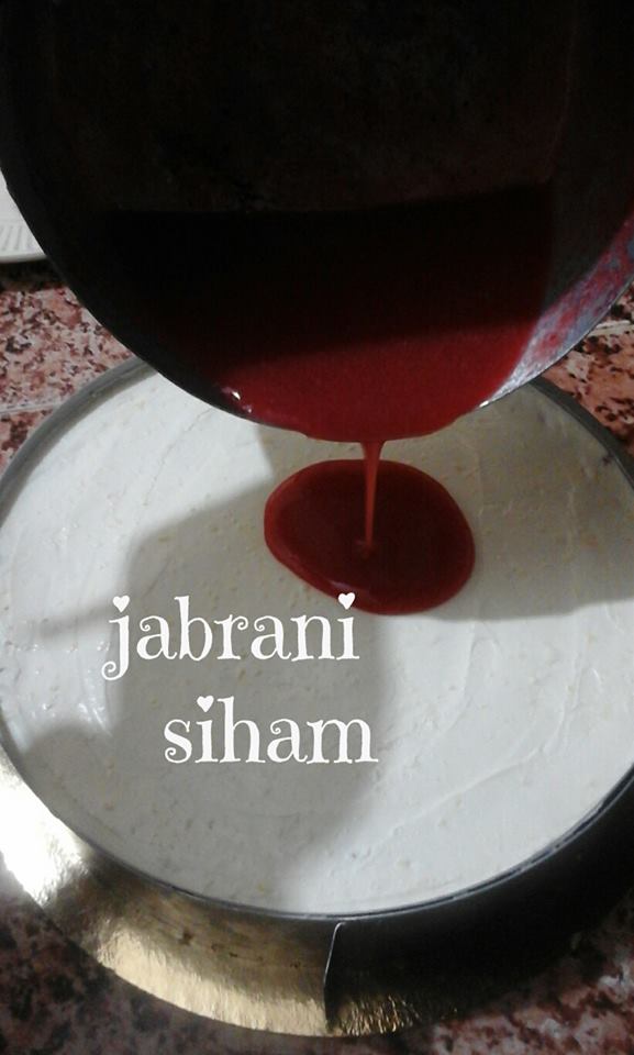 ونحضر الطبقة الاخيرة اللي فيها :200g فريز مطحون مع نصف كاس سكر ونعمله فوق النار حتى يغلا ونضيف له 2وريقات جيلاتين اللي عملناهم في الماء بارد من قبل ومعصورين ونطفئ عليه وحتى يبرد تماااما ونضيفه للحلوى كطبقة اخيرة وندخلها للثلاجة يستحسن ليلة كاملة وتقدم باردة