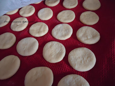 نفتح العجين بسمك نصف سم تقريبا نقطع أقراص، نرتبها فوق فوطة ونغطيها بفوطة أخرى ونتركها ترتاح 20 د